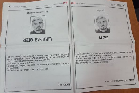 "Tvoja smrt danas je probudila ono što sam godinama umirivao u sebi, svako zna što mu je činiti", piše između ostalog u čitulji Jovana Vukotića, koji je trenutno u zatvoru u Srbiji.