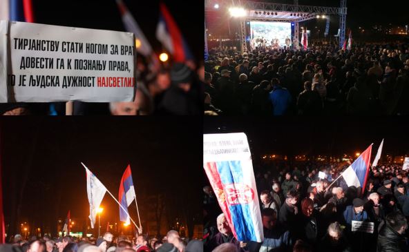 Skup opozicije počeo je sa intoniranjem himne Srbije "Bože pravde", a okupljenima se prvi obratio penzionisani major VRS Brano Pejanović.