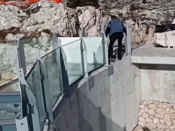 Na snimku, koji je objavio Dalmatinski portal, vidi se čovek koji hoda po staklenoj ploči na vidikovcu na kojem se još vide rupe tamo gde bi trebalo da budu nosači za zaštitnu ogradu. Na kraju preskače ogradu i rizikuje pad u provaliju.