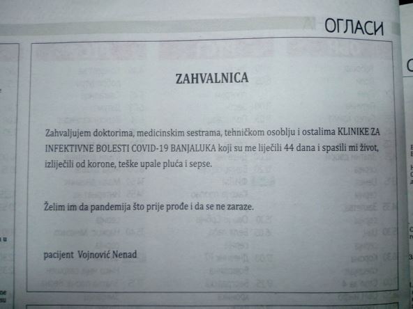 „Zahvaljujem doktorima, medicinskim sestrama, tehničkom osoblju i ostalima Klinike za infektivne bolesti COVID-19 Banjaluka koji su me lečili 44 dana i spasili mi život, izlečili od korone, teške upale pluća i sepse. Želim im da pandemija što pre prođe i da se ne zaraze“, stoji u oglasu koji potpisuje pacijent Vojnović.