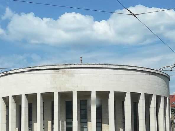 Tada je Gotovac go stajao na kupoli na vrhu zgrade HDLU-a, u stavu kontraposta, licem okrenut prema istoku.
