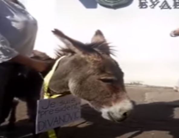 Ispred opštine Budva jutros je i bivša urednica TV Budva Iva Bajković koj je sa sobom povela magarca sa poruko okačenom o vrat životinje - "Je suis president Divanović".