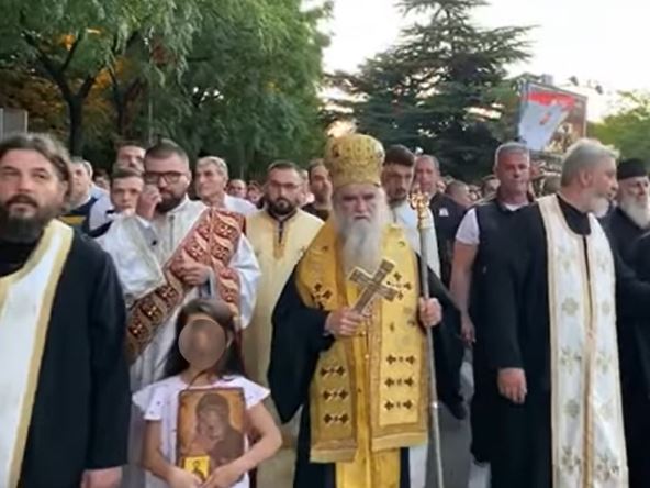 Prijava je podneta jer je liturgiji prisustvovalo oko 50 građana, a jedno lice uhapšeno je zbog isticanja dve "zastave druge države" (Srbije), javlja Srna.