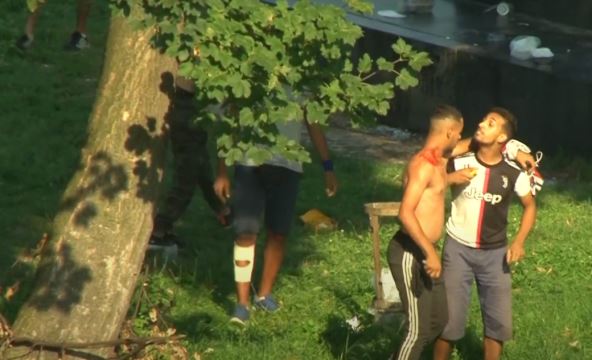 Kako prenosi portal "Kliks", dve osobe su povređene. Objavljen je i video-snimak incidenta na kom se vidi da su migranti koristili letve i noževe.