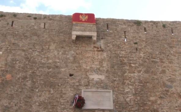 Građani okupljeni ispred zidina Starog grada u Budvi okačili su crnogorsku zastavu na spomen ploču "srpskim oslobodiocima"