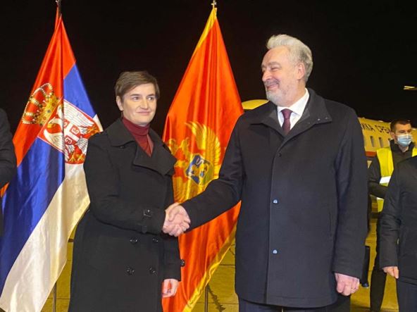 Na podgoričkom aerodromu večeras je premijerku Srbije Anu Brnabić dočekao crnogorski kolega Zdravko Krivokapić i ministarka zdravlja Jelena Borovinić Bojović.