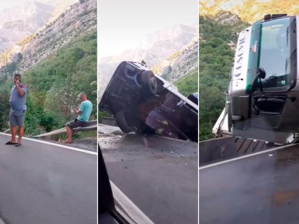 Na snimku objavljenom na društvenim mrežama vidi se užasavajući prizor šlepera prijepoljskih tablica koji visi sa litice, kao i policijsko vozilo na mestu nezgode.