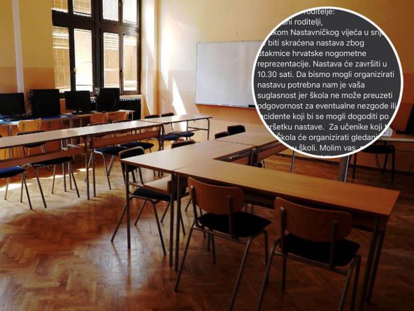 Roditelji jedne zadarske gimnazije dobili su poruku da je Nastavničko veće odlučilo da se nastava u sredu skrati zbog utakmice hrvatske fudbalske reprezentacije. Pošto utakmica počinje u 11, deca će završiti školu u 10:30. Za učenike koji to žele škola će organizovati gledanje utakmice u svojim prostorijama.