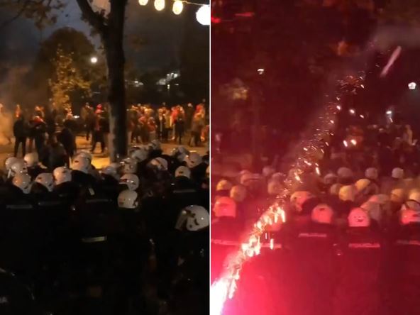 Iz pravca "Kraljevog parka" je došlo oko tridesetak mladića koji su napali policiju koja je uzvratila suzavcem! Napadači su na glavama imali fantomke i policiju su napali biber sprejom. Nasrnuli su na ogradu ispred Skupštine.