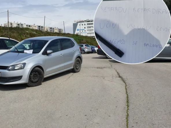 Kako se može videti na fotografiji, on je svoj srebrni VW Polo parkirao na kolovoz uz drugo vozila i tako, čini se, blokirao pristup parkiralištu, ali i izlazak iz njega. Zbog toga mu je drugi vozač ostavio poruku na komadu papira koji je stavio na šoferšajbnu.