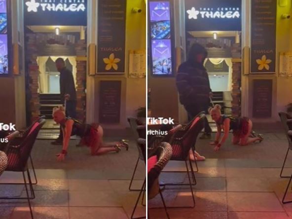 A sada, mladić je prošetao centrom grada, vodeći veoma prkosno obučenu devojku u kratkoj suknji, mrežastim čarapama i štiklama na povodcu. Kako se vidi iz snimka objavljenog na TikToku, ona se zaista uživela u ulogu četvoronožnog ljubimca, pa je čak i zalajala na slučajnog prolaznika.