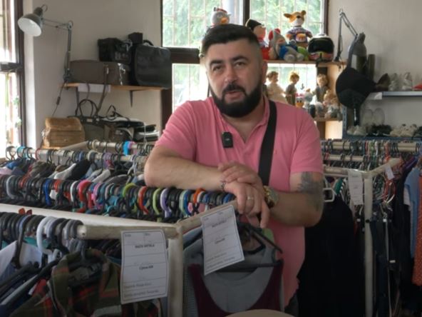 Radnju je otvorio ima sedam-osam godina i posluje dobro, ne žali se, a koliko proda i zaradi, skoro isto toliko da džabe i pokloni. Na pitanje zašto, kaže, seća se kako je njemu bilo kad nije imao ništa. "Imao sam težak život, a kad sam ovo stekao, osećam da nemam pravo da zaboravim ono sve... I da nemam pravo da okrećem glavu od slučajeva kojima treba pomoć. Pre osam godina sam ovo otvorio i moj naum je bio, i danas se toga držim, da garderoba treba da košta minimalno, tek toliko koliko treba da platim robu, radnike, najam....tako i ja prodajem... A redovno objavljujem na stranici da kome treba garderoba, obuća, a da nema da plati, da dođe i da uzme šta god mu treba... Ja to platim, i stavim u kasu... Inače, imamo i suđe ovde... A da ima kojima je to potrebno, ima... Mi to idemo tajno, i ne želim da reklamiram te situacije kad dajem...", zabeležio je Dinove reči svojom kamerom Srećko Stipović, koji krstari Bosnom u potrazi za ovakvim ljudima i ovakvim pričama.