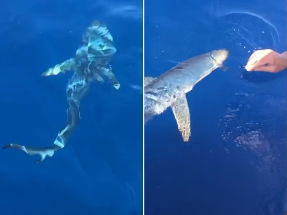 Na Jadranu kod gradića Trpanj u Hrvatskoj zabeležena je neverovatna scena gde se vidi kako ribolovac hrani i mazi mladog modrulja (morski pas). Snimak je objavio Tuna bar Pelješac iz Trpnja.