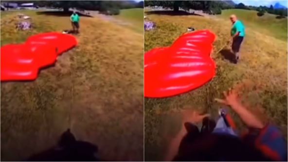 Na snimku vidimo neobičnu scenu: čovek je padobranom sleteo na livadu, ali njegov dolazak nije naišao na dobar prijem kod vlasnika parcele. Jedan stariji čovek, vidno iznerviran što sa neba dolazi nepoznati padobranac, odmah je reagovao. U rukama je držao palicu i pretio da će ga prebiti, dok zbunjeni padobranac ponavlja: "Izvini". Ali izvinjenje nije bilo dovoljno da se vlasnik smiri. Imaš jedan minut da odletiš!", viče starac, jasno stavljajući do znanja da ne želi nezvane goste.
