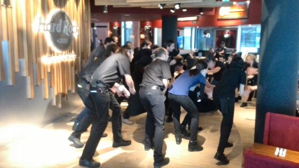 Osamdesetak konobara, šankera i pomoćnog osoblja prvog balkanskog Hard Rok Kafea zatekli smo, naime, u plesu oko šanka. Po usklađenosti plesa bilo je jasno da je reč o već dobro uvežbanoj tački, a ostaje enigma da li će ovu koreografiju ponekada moći da vide i gosti kafea ili je reč o internom zabavljanju.