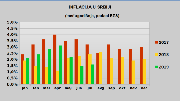 U julu su pojeftinili proizvodi i usluge u grupama hrana i bezalkoholna pića (1,3 odsto), odeća i obuća (0,8%), restorani i hoteli (0,5 odsto), transport (0,4 odsto) i komunikacije (0,3 odsto).
