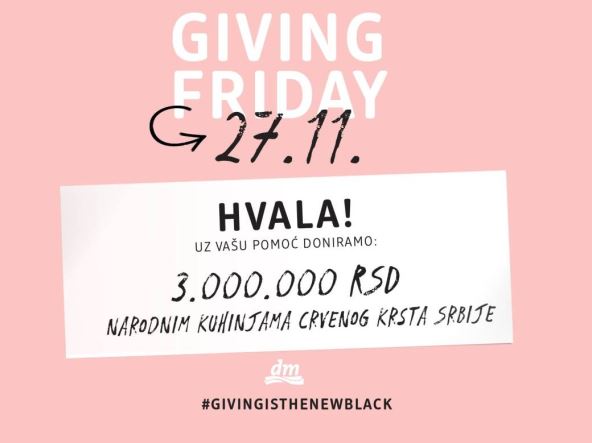 Drugu godinu zaredom kompanija dm drogerie markt Crnom petku daje novo značenje usmeravajući pet odsto prometa tog dana u humanitarne svrhe. Kako su saopštili iz kompanije, u petak, 27. novembra, prikupljeno je ukupno tri miliona dinara koji će biti donirani narodnim kuhinjama Crvenog krsta Srbije.