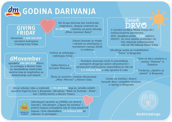 Svoju poslovnu vodilju „Zajedno jedni za druge" dm je nastavio da potvrđuje i prilikom svakog otvaranja novih i preuređenja postojećih drogerija kada donira deo prometa zdravstvenim i obrazovnim institucijama kroz tradicionalni humanitarni sat. Samo tokom ove godine kompanija je na ovaj način prikupila više od 3,5 miliona dinara koji su raspoređeni različitim ustanovama u vidu robe i kupovine neophodne opreme.
