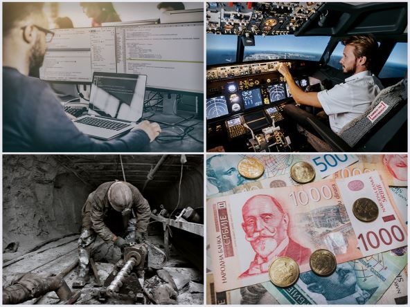 Definitivno najplaćeniji u Srbiji bili su programeri. Primili su u proseku 173.628 dinara. Drugi na listi su zaposleni u vazdušnom saobraćaju, čija je zarada iznosila 148.208 dinara. Zaradu od 128.446 dinara donosila je ekspolatacija sirove nafte i prirodnog gasa. Oni koji su to radili bili su nepunu hiljadu plaćeniji od angažovanih na naučnom istraživanju i razvoju, koji su zaradili 127.901 dinara. Prosek duvandžija je bio nešto slabiji i iznosio je 120.662 dinara. Uslužne delatnosti u rudarstvu i geološkim istraživanjima obezbedile su platu od 114.430 dinara.