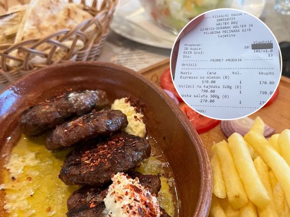 Kako se vidi na računu, na njemu se nalaze uštipci od mesa sa kajmakom, šopska salata kao i espreso sa mlekom. Cena kafe iznosi neverovatnih 170 dinara, 300 grama šopske salate je 270 dinara, a uštipci na kajmaku su 790 dinara. Ceo račun iznosi 1.230 dinara.