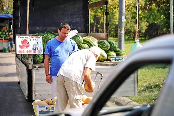 "Prve količine lubenica prodavali smo na veliko za 70 dinara kilogram, a dinju za 150. Sada su te cene pale na 25-30 i 60 dinara, jer je u međuvremenu prispeo bostan i iz drugih krajeva, pa je konkurencija učinila svoje", priča Slađana Vučić, koja sa suprugom Radisavom gaji lubenice i "nekoliko redova" dinja na njivi od 4 jutra.