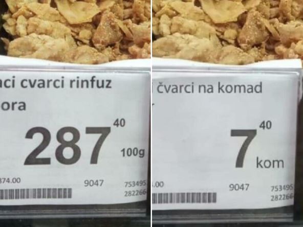 Ranije je objavljena vest da se čvarci u jednom marketu prodaju na komad i da je cena jedne "svinjske bombone" 7,40 dinara. Međutim, prema poslednjim informacijama, reč je o fotošopu.