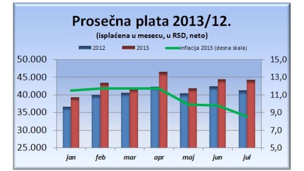 Prosečna neto zarada isplaćena za sedam meseci 2012. godine nominalno je veća za 6,3 odsto od zarade isplaćene u istom prošlogodišnjem periodu, a realno je manja za 4,1 odsto, dok je prosečna bruto zarada nominalno veća za šest odsto, a realno manja za 4,3 odsto.