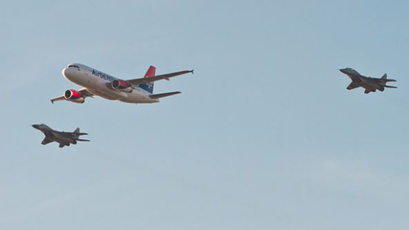 Sve vreme leta, avionu pratnju čine avioni Vojske Srbije "super galeb G4" i dva aviona "mig 29" koji izvode aktivnosti u oviru redovne letačke obuke "praćenje civilnog aviona".