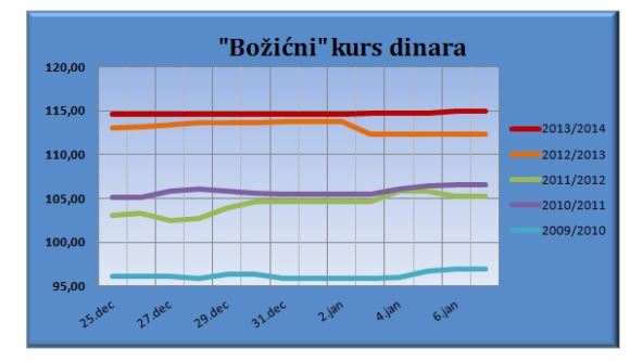 Tokom božićnih praznika primenjuje se kursna lista od ponedeljka, 6. januara, a od srede, 8. januara, nova lista NBS, prema kojoj će zvanični srednji kurs evra iznositi 115,1102 dinara.