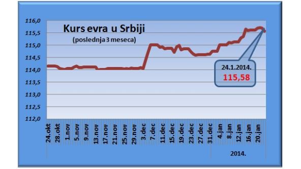 Dinar će danas vredeti 115,58 za jedan evro a od početka godine srpska valuta je oslabila za skoro jedan dinar prema evru.
