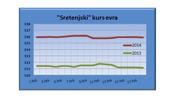 Domaća valuta je ove godine bila najjača 1. januara, kada je jedan evro koštao 114,6421 dinara, a najslabija 7. februara, kada je jedan evro vredeo 116,1253 dinara.