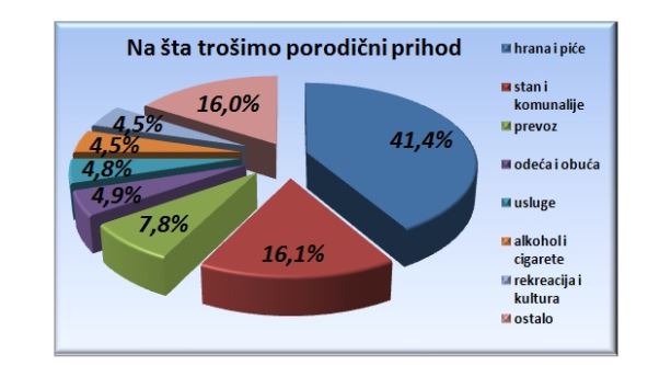Prosečni mesečni izdaci za ličnu potrošnju domaćinstava iznosili su 52.819 dinara, od čega najviše ide na hranu i bezalkoholne napitke (41,4 odsto), a zatim na stanovanje, vodu, struju, gas i ostala goriva (16,1 odsto).
