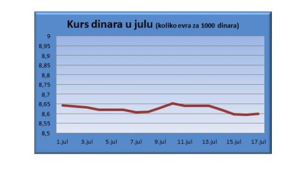 Najviša srednja vrednost kursa dinara bila je 1. januara ove godine, kada je jedan evro iznosio 114,6421 dinara, a najniža 15. jula sa vrednošću evra od 116,3215.