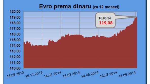 Dinar je ove godine bio najjači 1. januara, kada je jedan evro koštao 114,6421 dinara.