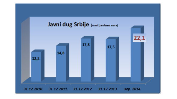 Na kraju 2013. godine javni dug Srbije iznosio je 20,14 milijardi evra, odnosno 59,6 odsto BDP.