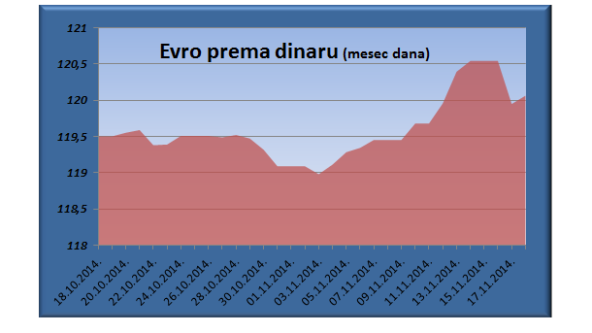 Najviša srednja vrednost kursa dinara bila je 1. januara ove godine, kada je jedan evro iznosio 114,6421 dinar, a najniža 14. novembra 120,5412 dinara za evro.