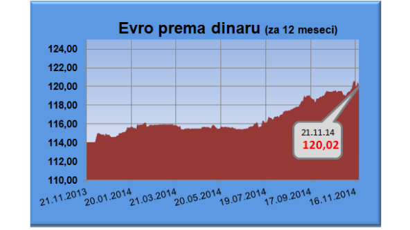 Najviša srednja vrednost kursa dinara bila je 1. januara ove godine, kada je jedan evro iznosio 114,6421 dinar, a najniža 14. novembra, 120,5412 dinara za evro.