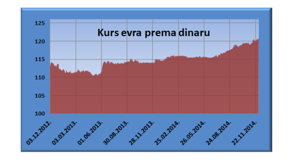 Najviša srednja vrednost kursa dinara bila je 1. januara ove godine, kada je jedan evro iznosio 114,6421 dinar.