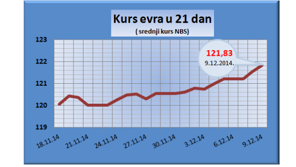 Najviša srednja vrednost kursa dinara bila je formalno od 1. do 3. januara ove godine, kada je novogodišnja cena jednog evro iznosila 114,6421 dinar. Već prvog dana formiranja kursa u 2014. godini (4. januara) dinar je bio slabiji i preskočio je kotu 115 za evro.