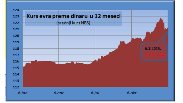 Prošle godine najviša srednja vrednost kursa dinara bila je 1. januara (prenesena iz poslednjih dana 2013.), kada je jedan evro iznosio 114,6421 dinar, a najniža 18. decembra - 122,6321 dinar za evro.