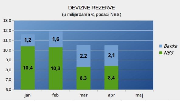 Neto devizne rezerve na kraju aprila iznosile su 8, 37 milijardi evra i predstavljaju ukupne rezerve bez deviza obaveznih rezervi komerecijalnih bananka, kao i za sredstva povučena od MMF-a, u okviru aranžmana zaključenog 2009.