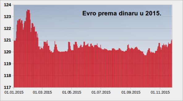 Najniža vrednost dinara prema evru ove godine bila je 29. januara, 123,57 dinara, a najviša je bila 1. oktobra, 119,7162 dinara.