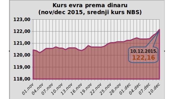 Najniža vrednost dinara prema evru ove godine bila je 29. januara, 123,57 dinara, a najviša je bila 1. oktobra, 119,7162 dinara.
