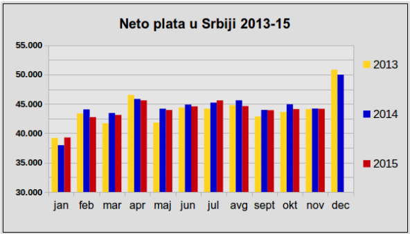 U periodu januar-novembar 2015. godine, prosečna isplaćena neto plata isplaćena u Srbiji je nominalno manja za 0,5% i realno za 1,9% u odnosu na uporedni lanjski period, dok je isplaćena prosečna bruto zarada u posmatranom periodu bila nominalno niža za 0,8% a realno za 2,2% u poređenju sa 11 meseci 2014. godine.