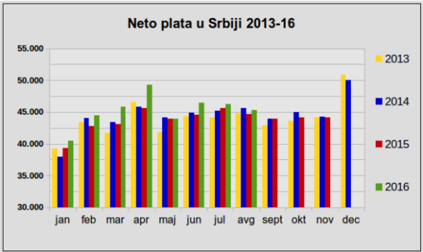 U odnosu na isti mesec 2015. godine, avgustovska neto plata beleži rast od 1,5 odsto nominalno (u količini dinara)i od 0,3 odsto realno (kada se uračuna i inflacija).
