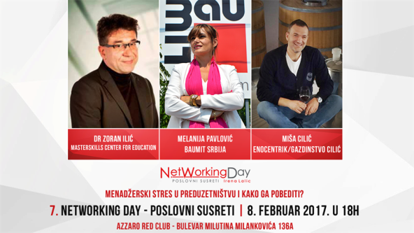 Sedmi NetWorking Day u goste dovodi iskusnog psihijatra i biznis kouča, dr Zorana Ilića, koji se problemom stresa i promena bavi i u okviru interaktivnih radionica namenjenim top menadžerima, Melaniju Pavlović, direktorku kompanije Baumit Srbija, uspešnu i dimaničnu poslovnu damu koja predvodi kompaniju iz oblasti građevine, kao i preduzetnika Mišu Cilića iz Jagodine, vlasnika priznate domaće vinarije Cilić Gazdinstvo i firme Enocentrik doo koja projektuje vinarije širom planete.