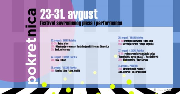 Pokretnicu će otvoriti "Pojmovnik Oduzimanja vremena" Dunje Crnjanski i Frosine Dimovske, u utorak 23. avgusta u 20 časova u SKCNS Fabrici. Posle onlajn izvođenja na Tanztage festivalu u Berlinu i delegiranog izvođenja na Um(j)etnosti predavanja u Kelnu tokom 2021, "Pojmovnik" će imati svoje prvo predstavljanje uživo u Novom Sadu.