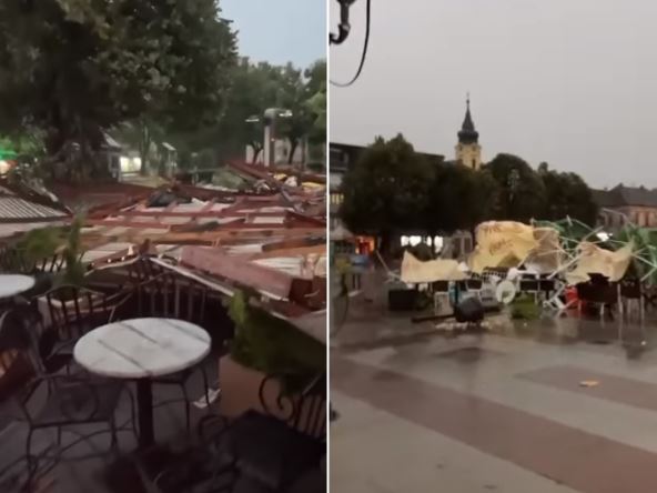 Na društvenim mrežama kruži dramatičan snimak iz centra Rume. Na Gradskom Trgu, kafići na šetalištu su potpuno uništeni. Jak vetar je polomio stolove, stolice i suncobrane i razneo ih okolo. Nevreme je pokidalo i krov sa Kulturnog centra.