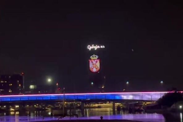 "Mi nismo genocidan narod. Pamtimo. Ponosna Srbija i Srpska", piše na kuli, dok se na njoj pojavljuju srpska zastava i grb.