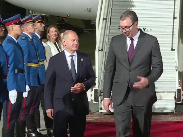 Nemački kancelar Olaf Šolc sleteo je večeras u Srbiju. Njega je na aerodromu "Nikola Tesla" u Beogradu dočekao predsednik Srbije Aleksandar Vučić.